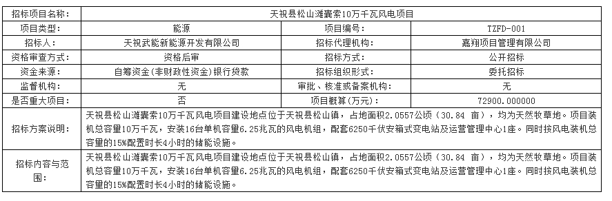標段名稱:E6200000600041474001001天??h松山灘囊索10萬千瓦風(fēng)電項目EPC總承包標段